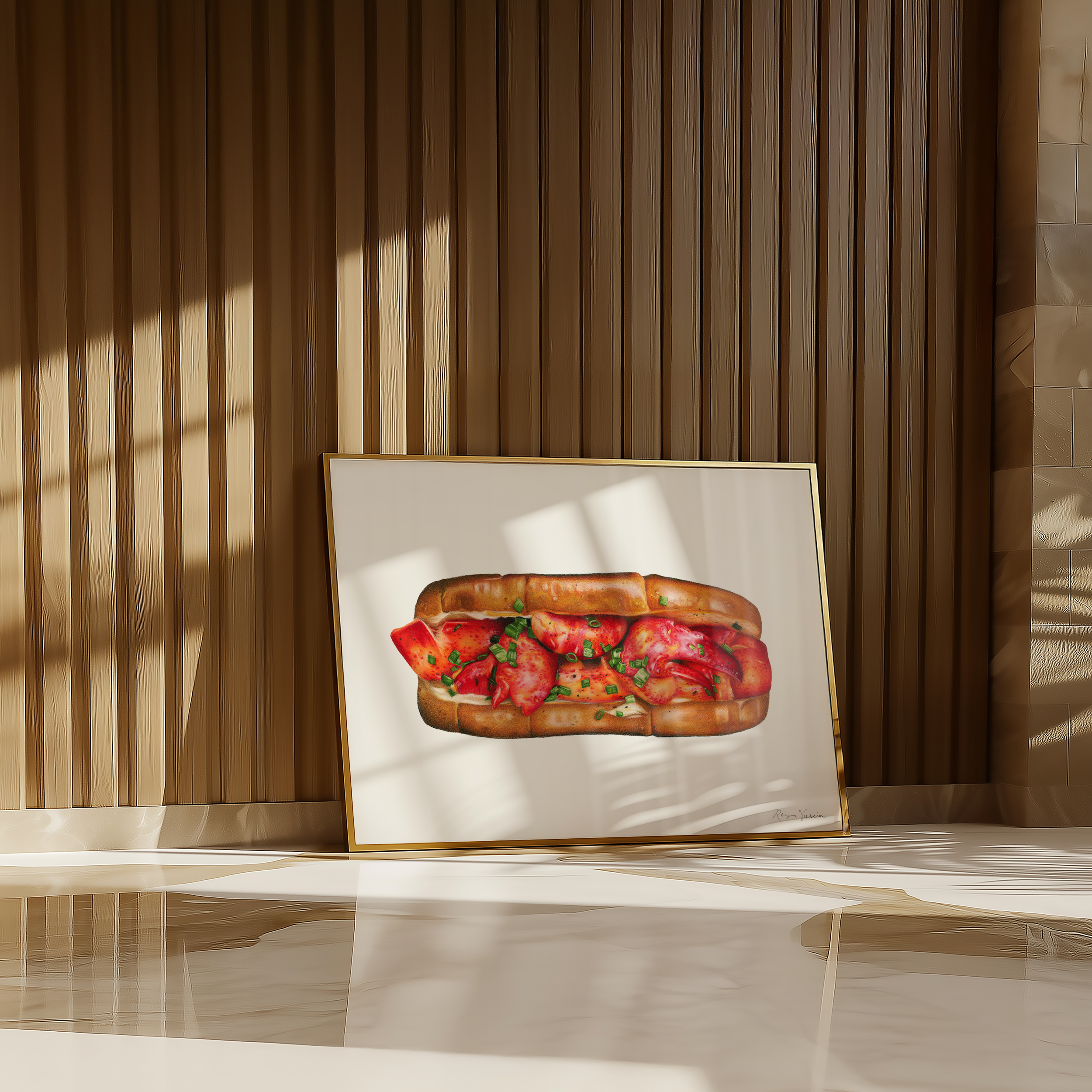 A framed original colored pencil hyperrealistic drawing of a Connecticut style lobster roll green onion chives. large scale luxury modern art for contemporary homes. art leaning against a wooden wall on display. chicago artist.