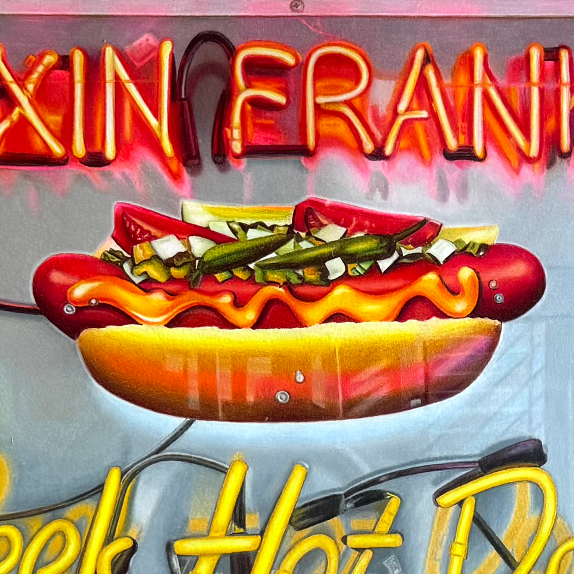 A hyperrealistic drawing of a colorful neon sign from the home depot hot dog stand in chicago: fixin franks hot dogs. colored pencil drawing of neon light and chicago dog.  chicago artist.